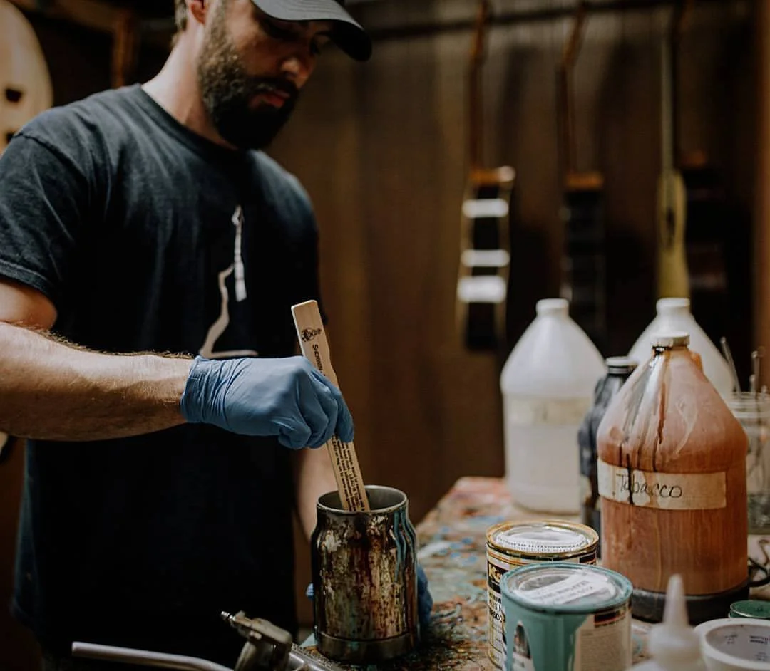 We spray a professional nitrocellulose finish with traditional methods and materials on most types of fretted instruments. We’re capable of finishing Archtops, Flat Tops, and Solid Bodies with either set or separate necks. Whether you want to match a period finish or make your instrument stand out with a custom shade, we can provide the highest-quality color-work to make your guitars look their best.